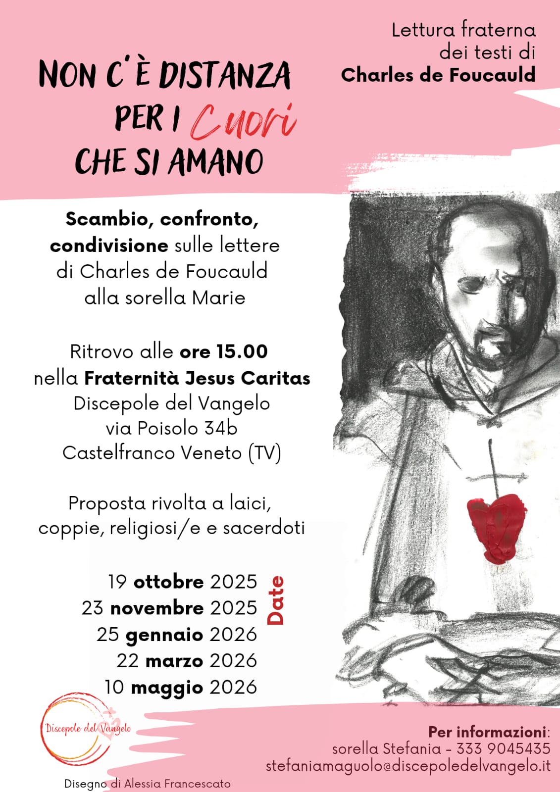 Dal desiderio di alcune persone di confrontarsi sulla propria vita cristiana, attraverso la spiritualità di Charles de Foucauld e la nostra esperienza di Discepole del Vangelo, è nato un gruppo che cerca spazi di incontro e fraternità per dialogare sulle dimensioni della preghiera, dell’accoglienza, della missione e aiutarci insieme a viverle nella nostra vita quotidiana e di famiglia.